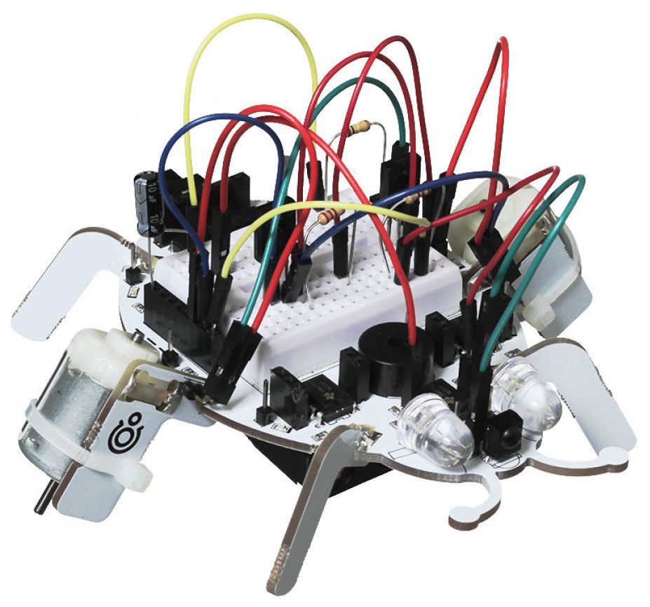В центре платформы — макетная плата. На ней собираются схемы экспериментов: подключаются двигатели, кнопки, конденсаторы и потенциометр. Никакой пайки!